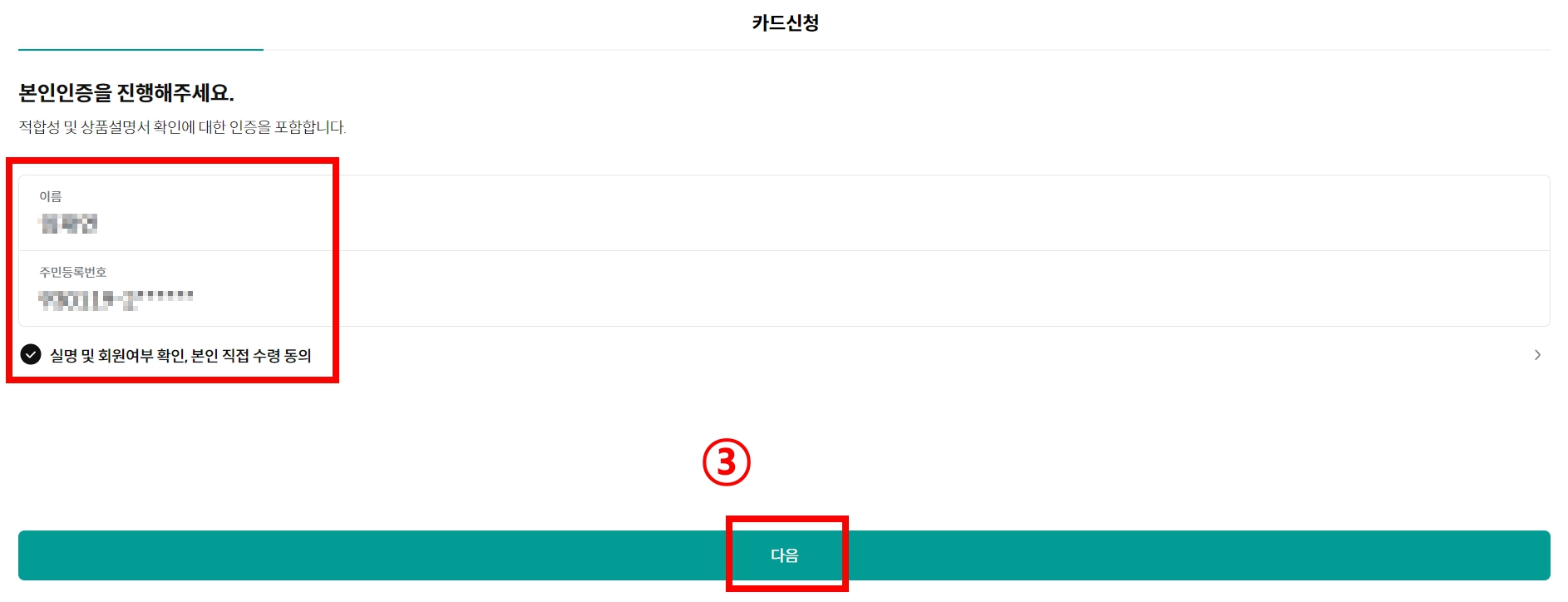 ③ 성함 및 주민등록번호 입력하고 '동의' 체크 후 [다음] 클릭합니다.
